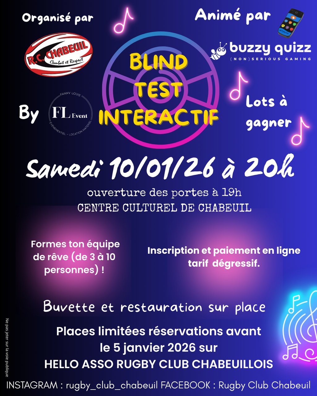 🚨 Uniquement sur réservations : https://www.helloasso.com/associations/rugby-club-chabeuillois/evenements/blind-test-buzzy-quiz
