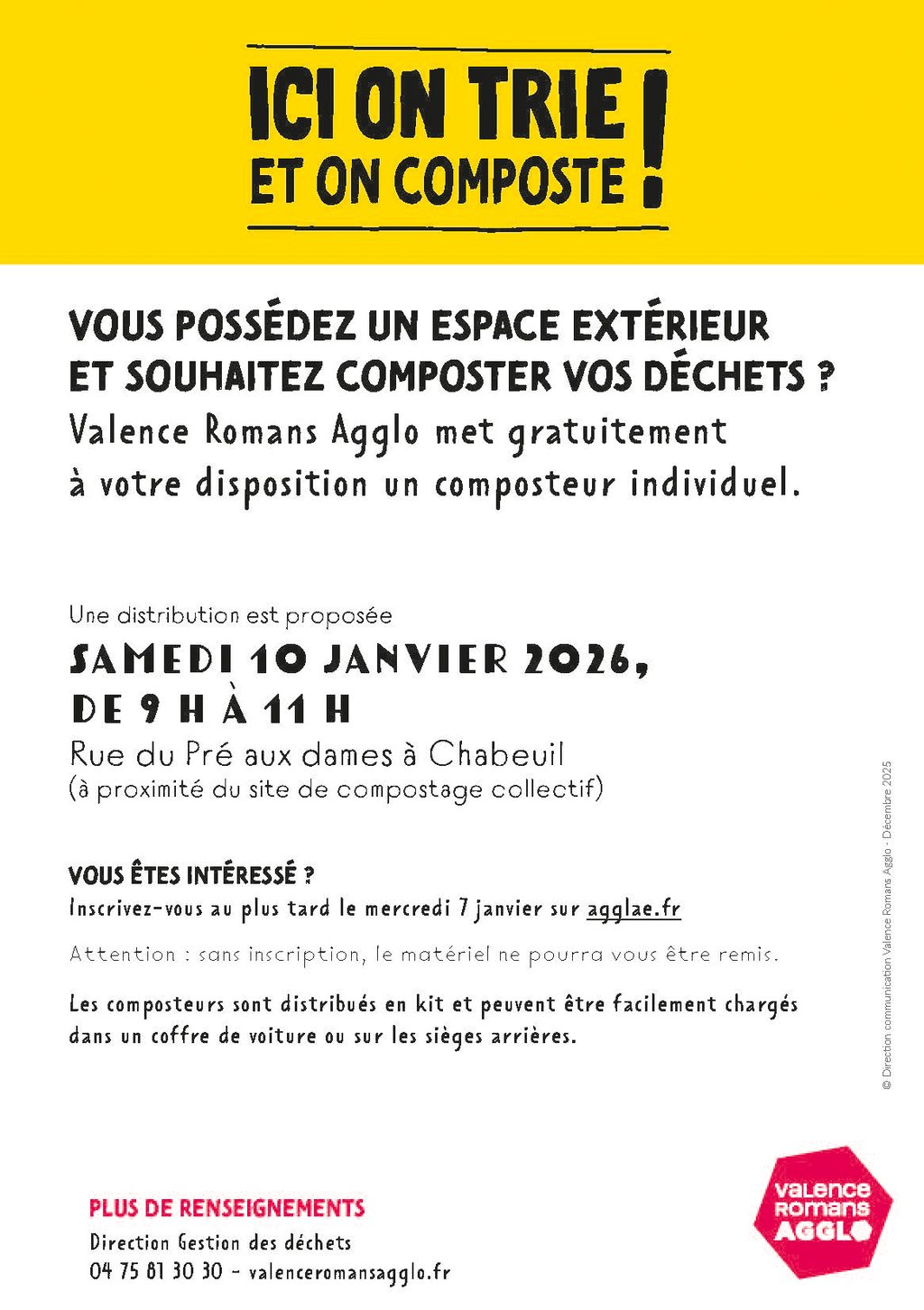 Dans le cadre de sa politique environnementale, Valence Romans Agglo met gratuitement à votre disposition un composteur individuel. Une distribution est organisée à Chabeuil tout prochainement.