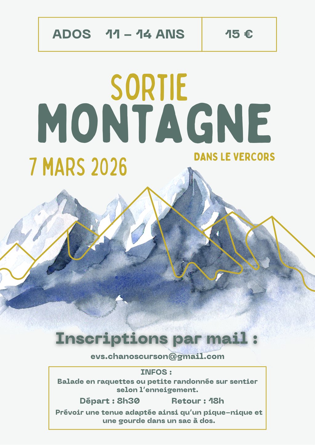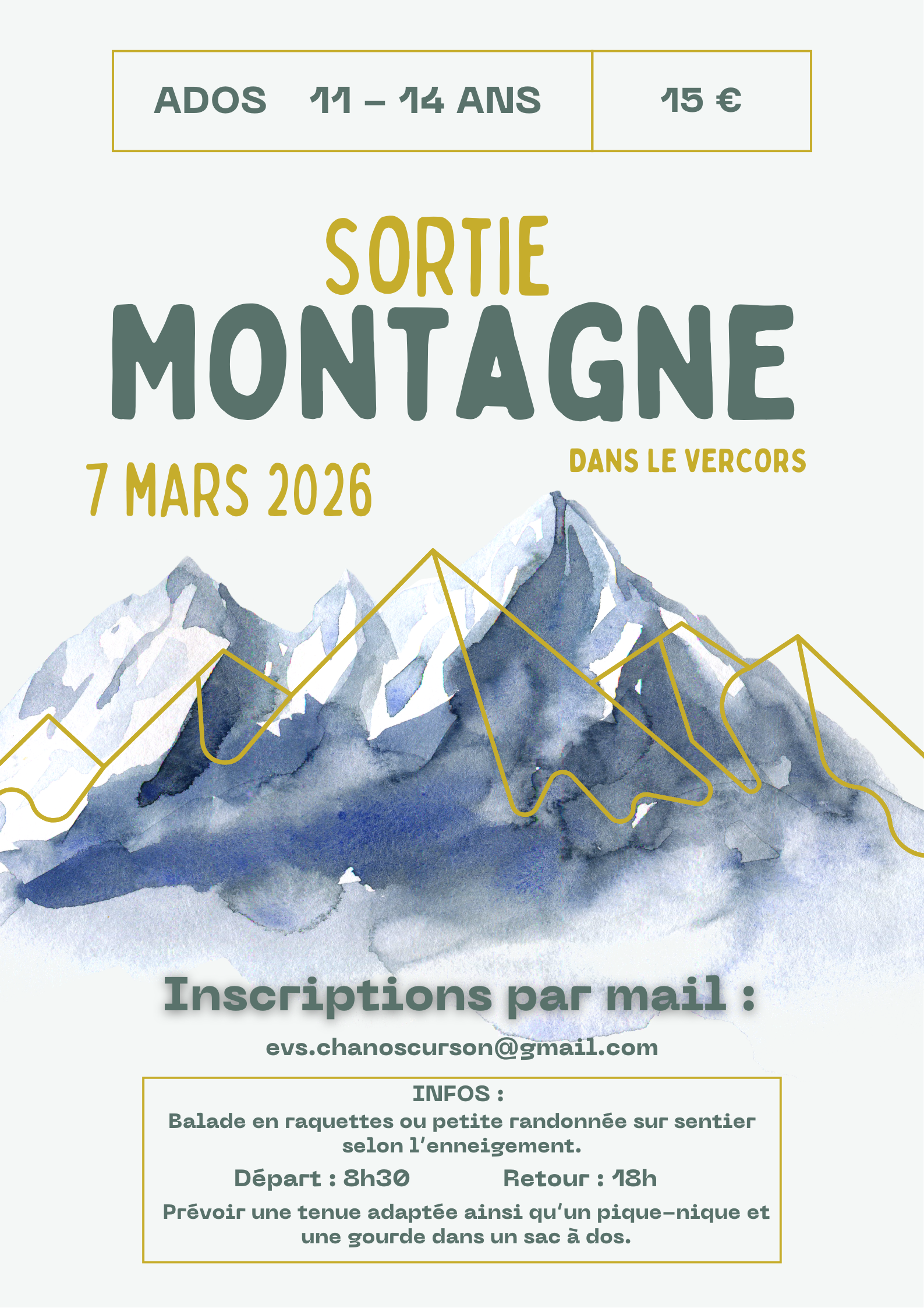Emie organise une journée à la montagne, raquette si neige, promenade sur sentier s'il n'y a pas de neige